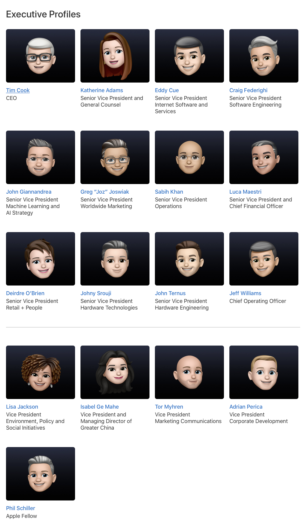 In addition, Apple updated its leadership page, shown below, to include everyone’s Memoji.